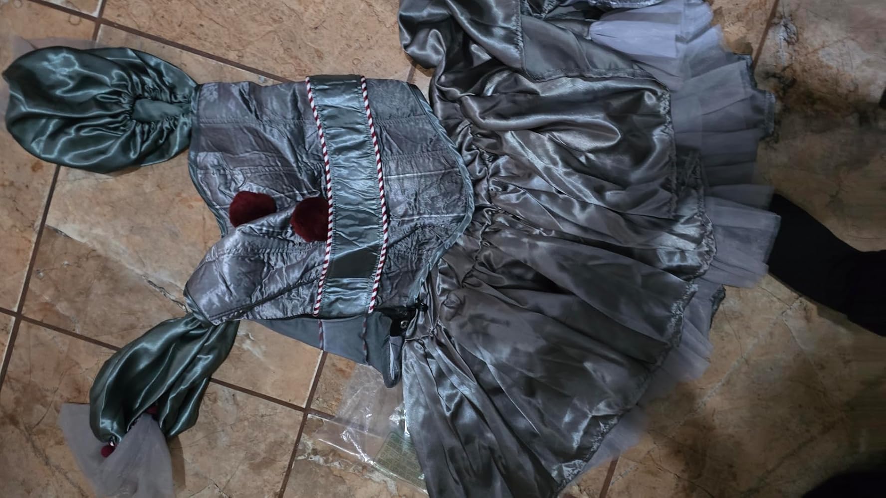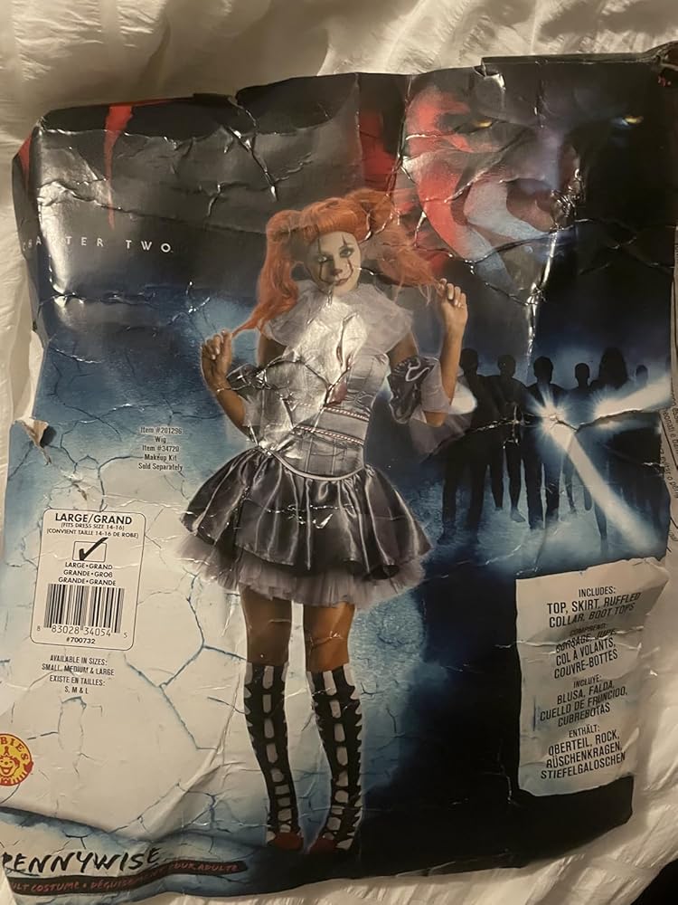 This item is used and gross. It looks like it was packed away in someone’s closet for years. The packaging is all banged up and there is make up all over the costume.
