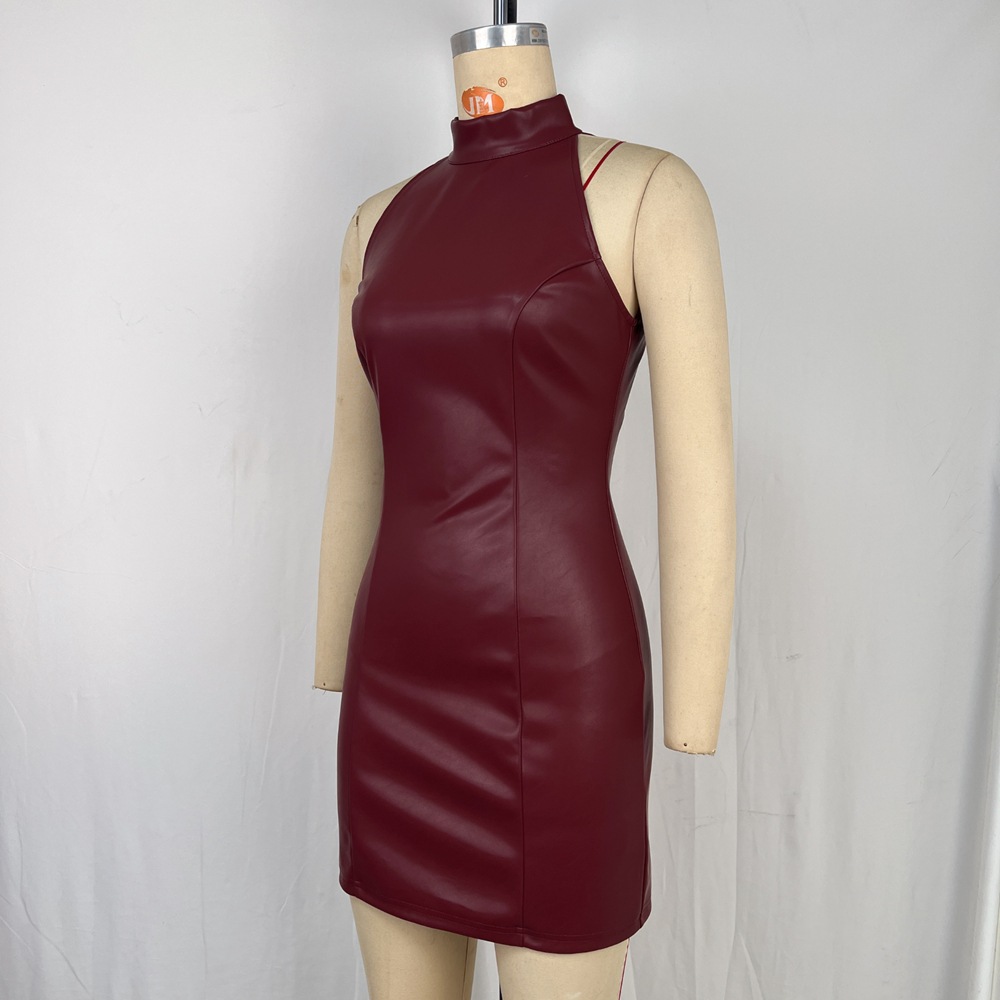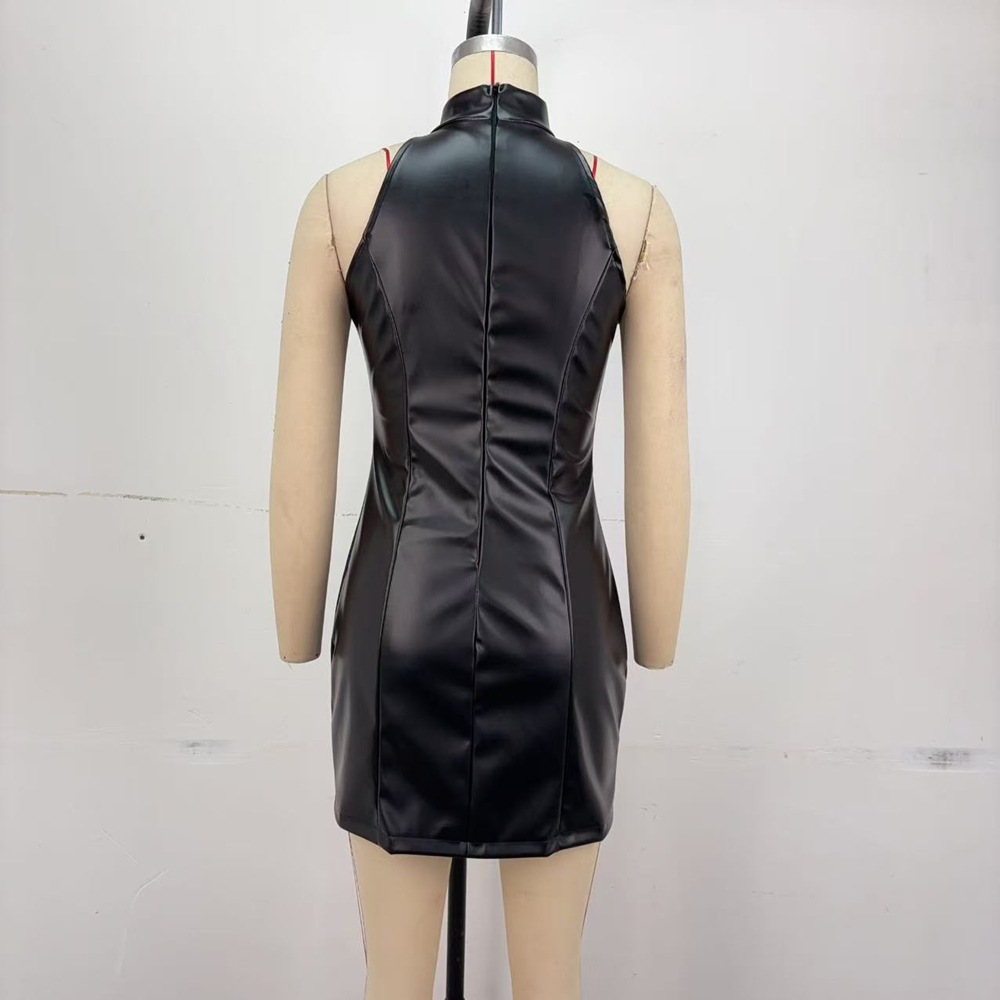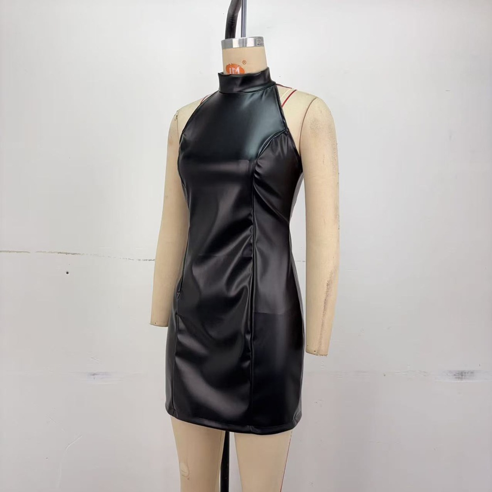 Women Clothing Autumn Winter Halter Slim Fit Sheath Faux Leather Dress